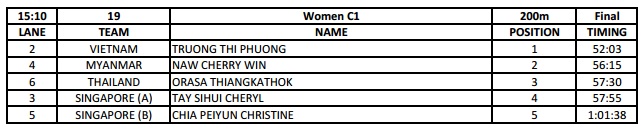 Congratulations to Gold medalist Truong Thi Phoung from Vietnam, who won by over 4 seconds over silver medalist Naw Cherry Win of Myanmar. Thailand’s Thiangkathok Orasa narrowly edged out Singapore’s Cheryl Tay for the final podium spot.
