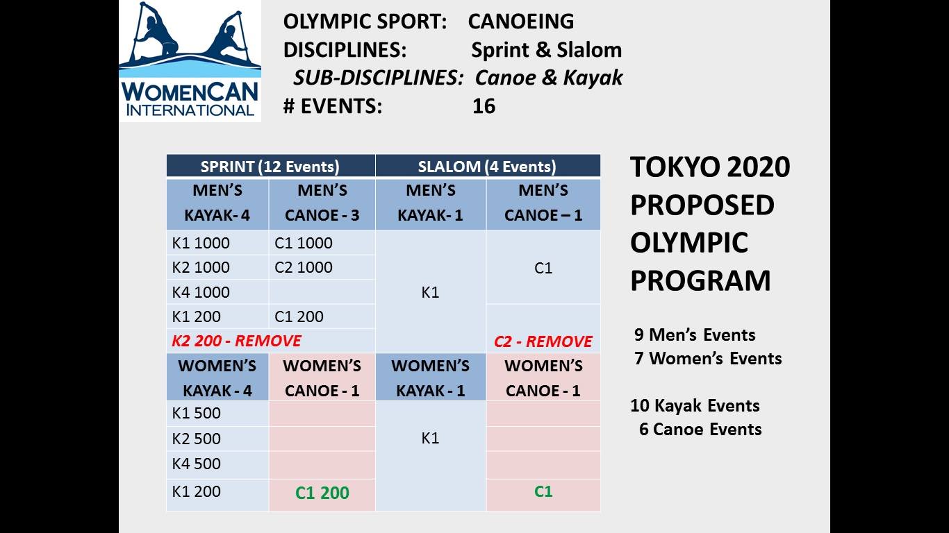 The lack of women canoeists and C4 (4 person canoe) has hurt canoe development since canoe/kayak was put on the Olympic program. The Olympics is losing its uniqueness.